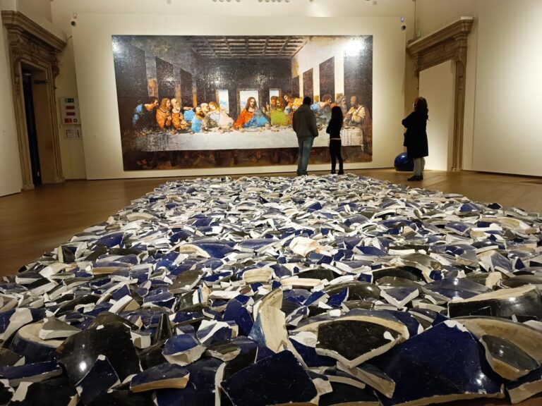 La mostra è iniziata a settembre ’24 ed è stata immediatamente oggetto di un atto vandalico, precisamente su “Porcelain cube” posto all’ingresso (per saperne di più: Vandalo distrugge opera d’arte di Ai Weiwei); un accadimento che mi ha fatto pensare subito alla demolizione del suo studio cinese del 2018, anche se lì l’atto veniva dall’autorità cinese con un chiaro scopo censorio, ostile e intimidatorio. Guarda caso, la prima sala inizia con un grande tappeto di cocci di ceramica blu provenienti proprio dalla demolizione del suo studio: Left Right Studio Material. Un ottimo modo per introdurci nella sua poetica conflittuale e provocatoria.