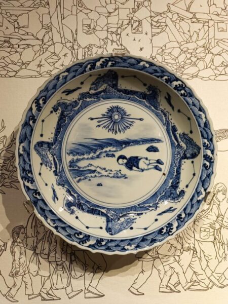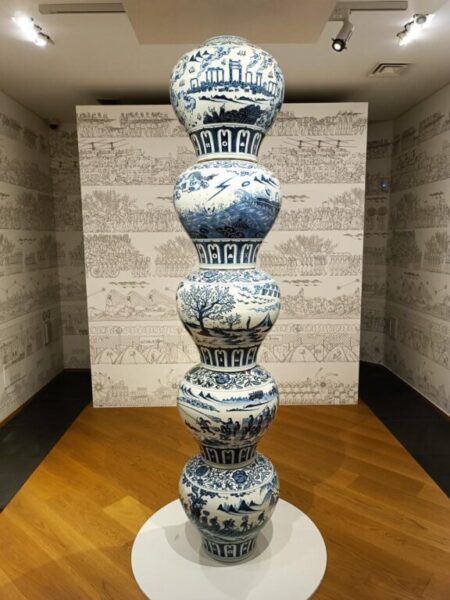 Porcelain pillar with refugee motif è tra i lavori più potenti di questa esposizione. Una trasposizione contemporanea del dramma dei rifugiati su ceramica. Una realtà odierna narrata come i drammi del mito con grande capacità ed efficacia. Vedere per credere.